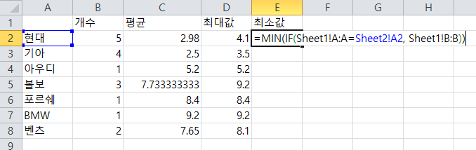 6. MIN과 IF 함수를 사용하여 현대차의 최저 금액을 구합니다.