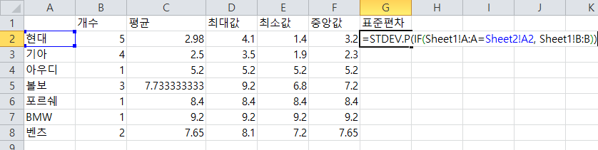 8. 이제 마지막으로 STDEV.P와 IF 함수를 활용하여 현대차의 표준편차를 구해보겠습니다.
