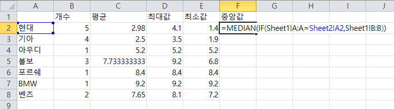 7. 이번에는 MEDIAN과 IF 함수를 활용하여 현대차의 중앙값을 구해보겠습니다.