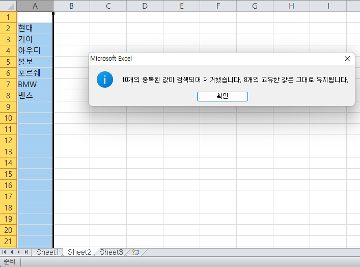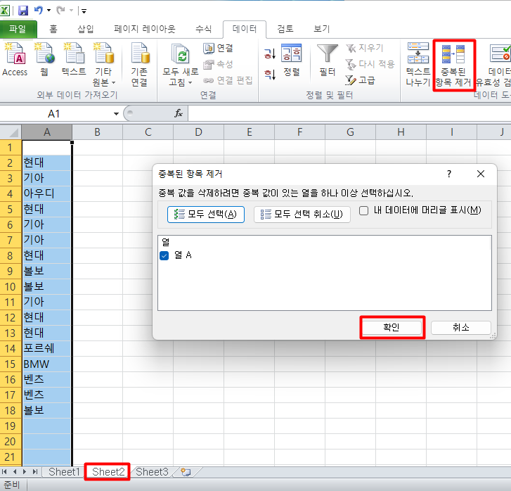 2. Sheet2에서 열 A를 선택한 후에 데이터 탭에서 "중복된 항목 제거"를 클릭합니다. 그 다음에 열 A가 잘 체크되어 있는지 확인한 후에 확인 버튼을 클릭합니다.