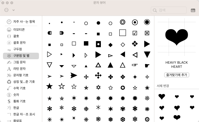 맥북에서는 control + command + space로 문자 뷰어 창을 띄울 수 있습니다.