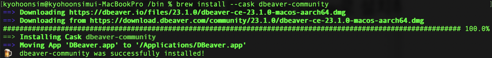 맥북에 DBeaver를 brew로 설치하는 명령어는 다음과 같습니다. 참고로 DBeaver는 각종 DBMS에 접속 가능한 GUI 클라이언트 프로그램입니다.