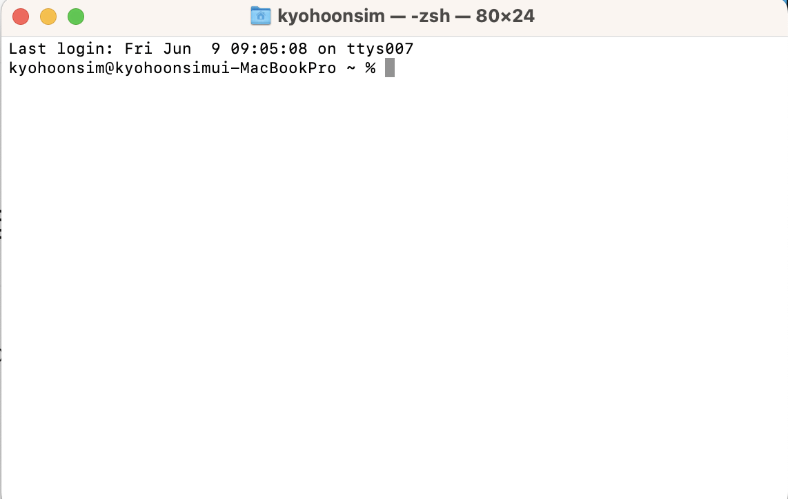 맥북에서 처음 터미널을 실행해보면 아래와 같이 배경은 흰색, 폰트는 검정색으로 설정되어 있습니다. 마치 메모장처럼 보이죠. 아무래도 터미널을 사용할 때는 검정 배경에 흰색 글자가 더 익숙한 것 같습니다.