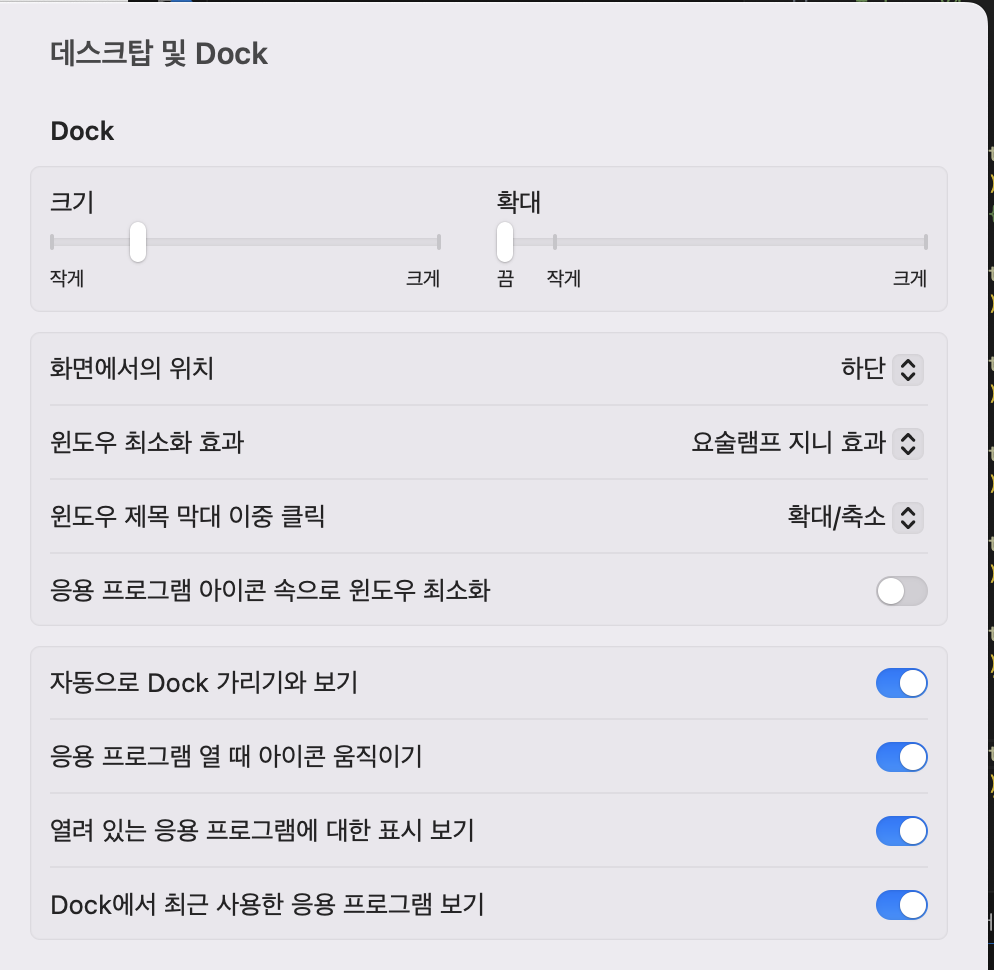 2. [데스크탑 및 Dock]이라는 창이 열릴 것인데, 거기서 [자동으로 Dock 가리기와 보기] 토글을 ON시키면 끝!