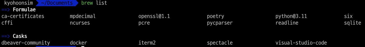 잘 설치되었는지 확인해보기 위해 brew list 명령을 주면 다음과 같이 잘 설치된 것을 확인할 수 있습니다. Casks 아래 docker 보이시죠?