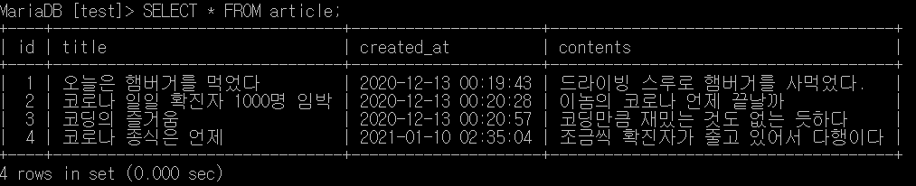 오늘은 테이블에서 특정 문자열이 포함된 행을 읽어서 보여주는 것에 대해 알아보도록 하겠습니다. 우선 다음과 같은 행들이 담겨져 있는 article이라는 이름의 테이블이 있다고 가정하겠습니다.