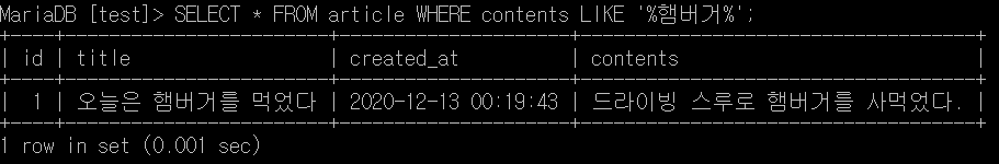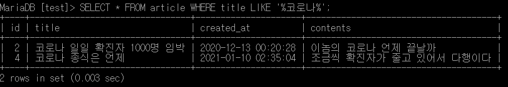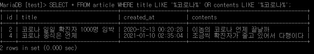 SELECT * FROM article WHERE title LIKE '%코로나%' OR contents LIKE '%코로나%';
