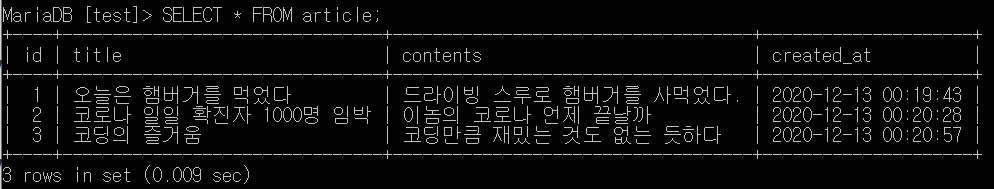MariaDB [test]> INSERT INTO article (title, contents) VALUES ('코로나 일일 확진자 1000명 임박', '이놈의 코로나 언제 끝날까');