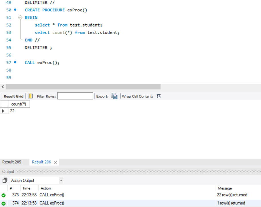 위와 같이 프로시저를 만들고, CALL로 호출했더니 두 개의 SQL 문이 순차적으로 실행된 것을 확인하실 수 있습니다. 첫번째 SQL문으로 인해서 22개의 행이 반환되었고, 두번째 SQL문으로 인해서 1개의 행이 반환된 것입니다.