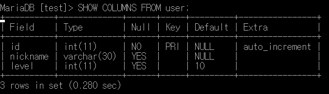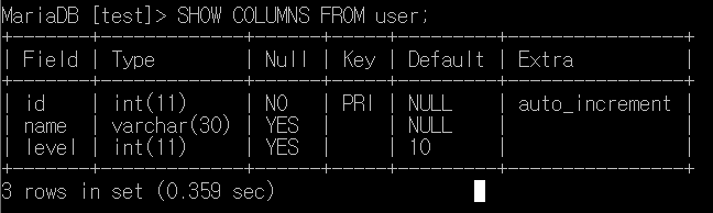 MariaDB [test]> SHOW COLUMNS FROM user;