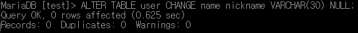 MariaDB [test]> ALTER TABLE user CHANGE name nickname VARCHAR(30) NULL;