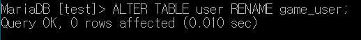 저는 test 데이터베이스 안에 있는 user라는 테이블의 이름을 game_user로 바꿔보도록 하겠습니다.