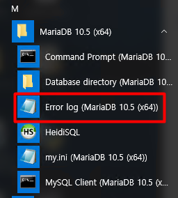 윈도우 PC에 설치되어 있는 MariaDB 서버의 에러 로그를 확인하고 싶은 경우에는 [시작 메뉴] - [MariaDB 10.5 (x64)]에 들어가셔서 Error log 파일을 여시면 됩니다.