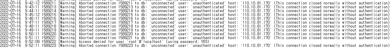 제가 방금 로컬에서 root 계정으로 접속을 시도하면서 일부러 틀린 비밀번호로 접속을 시도했더니 그에 대한 로그도 남아 있네요. [Warning] Access denied for user 'root'@'localhost' (using password: YES)