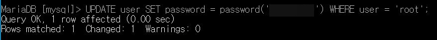 MariaDB [mysql]> UPDATE user SET password = password('원하는비밀번호') WHERE user = 'root';