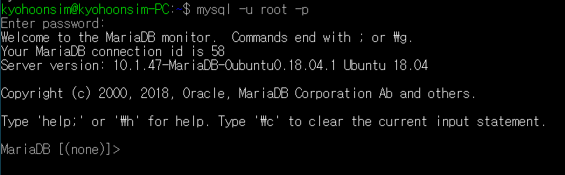 그럼 이제 exit; 로 나간 후에 바뀐 비밀번호로 접속이 되는지 확인해보겠습니다.