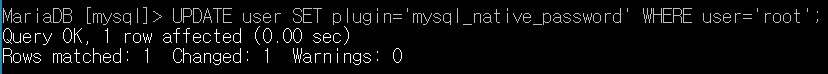 만약 mysql_native_password가 아니고 unix_socket과 같은 다른 값이 들어가 있다면 mysql_native_password로 업데이트해줍니다.