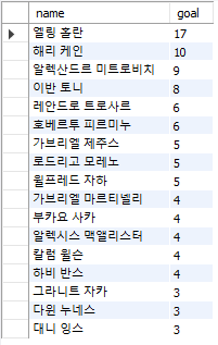우선 예시를 위해 epl 선수들의 골 수(2022-10-24 기준)를 담고 있는 간단한 테이블을 만들었습니다. 테이블 이름은 epl입니다.
