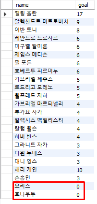 트리거를 생성했으니 한 번 비합리적인 데이터를 입력해보겠습니다. 먼저 음수인 골 수를 넣어보겠습니다. 그리고 105 골도 넣어보겠습니다.