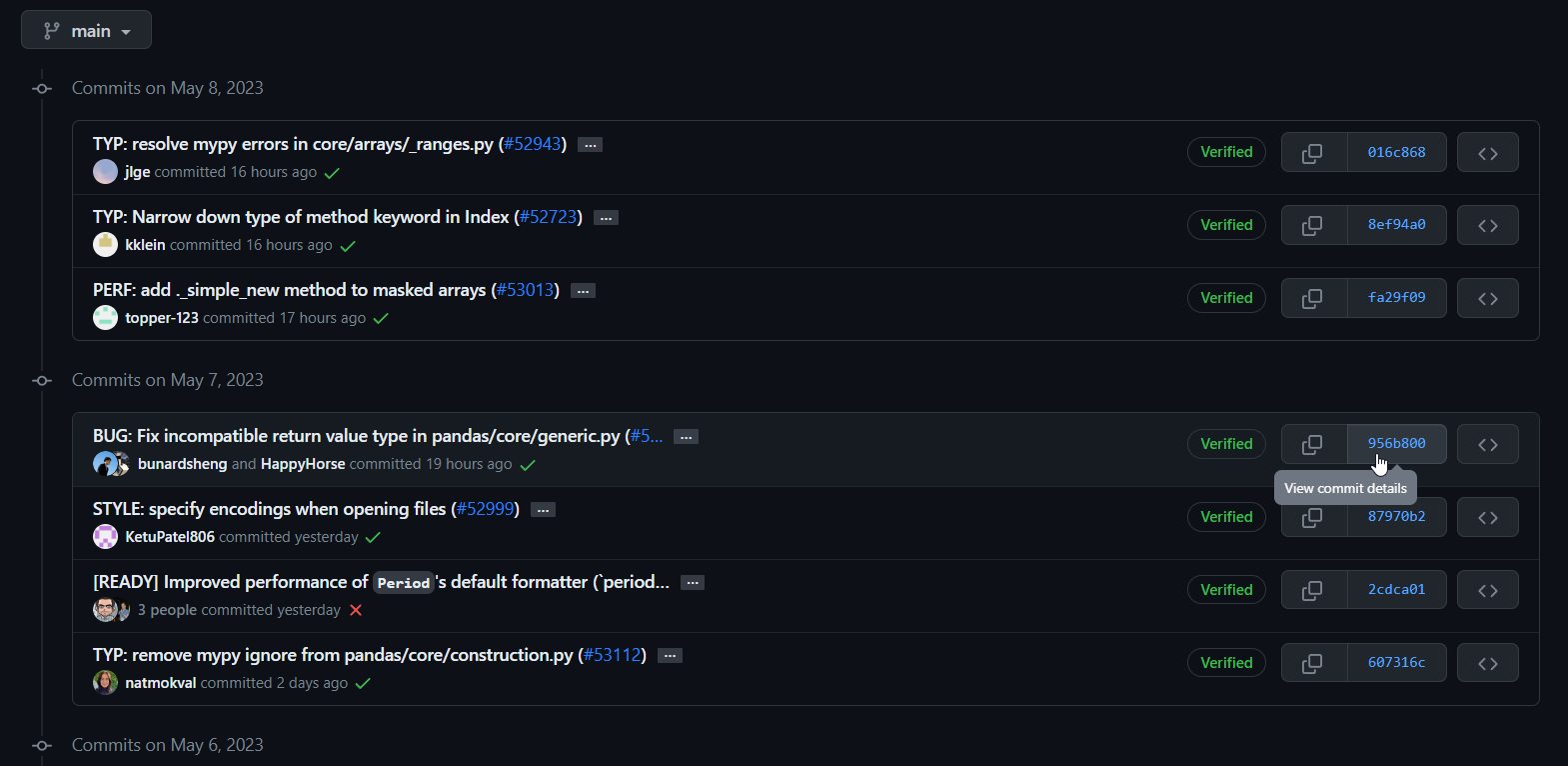 실제 pandas github에 들어가보면 해당 커밋 컨벤션으로 커밋 메시지를 남기는 것을 확인하실 수 있습니다.