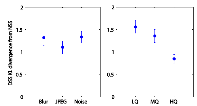 우선 품질이 나쁜 이미지에서 생성된 DSS일수록 NSS와 차이가 커졌다(아래 그림 오른쪽 참고). 하지만 이미지가 비슷한 정도로 왜곡되었다면 이미지에 가해진 왜곡 유형이 다르더라도 생성된 DSS는 NSS와 비슷한 정도의 차이를 보였다(아래 그림 왼쪽 참고). 즉, 왜곡의 유형보다는 강도가 NSS와의 차이에 더 큰 영향을 미친다는 것이다.