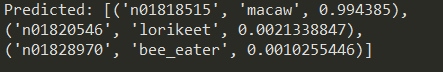 저는 가장 높은 확률을 가지는 3개의 결과가 나오도록 했습니다. 가장 큰 확률인 0.994385로 macaw(금강앵무)라고 분류했고, 두번째로 큰 확률인 0.0021338847로 lorikeet(청해앵무속), 세번째로 큰 확률인 0.0010255446로 bee_eater(벌잡이새류)라고 분류했습니다. 해당 이미지가 macaw일 확률이 절대적으로 크다고 ResNet50은 봤습니다.