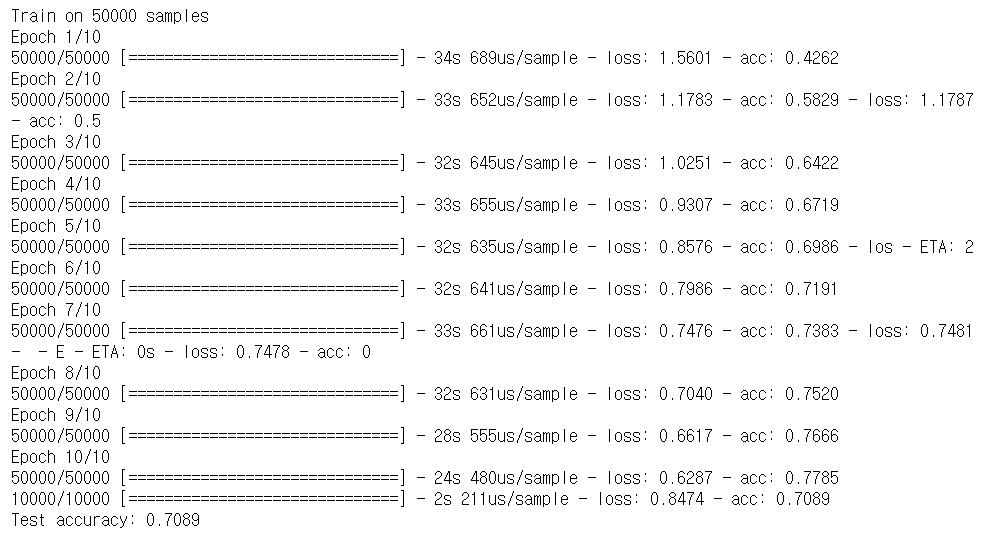 훈련방식을 결정한 다음에 훈련셋을 이용해서 모델을 훈련시킵니다. epoch는 10으로 설정했습니다.