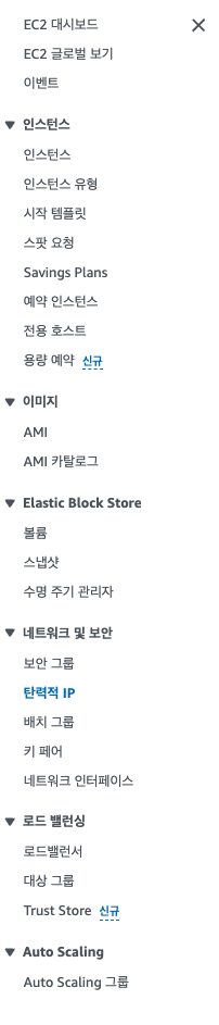 AWS 콘솔에서 EC2에 들어가서 왼쪽 메뉴를 보면 탄력적 IP(Elastic IP)가 있습니다.