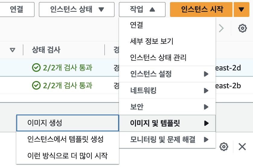 1. AWS 콘솔에서 AMI를 생성하고자 하는 EC2 인스턴스를 선택한 후에 [작업] - [이미지 및 템플릿] - [이미지 생성]을 클릭합니다.