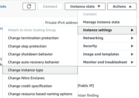 2. 인스턴스 중지가 완료되었다면, 작업(Actions) 드롭다운 버튼을 클릭한 후에 인스턴스 설정(Instance settings)을 클릭한 후에 인스턴스 유형 변경(change instance type)을 선택합니다.