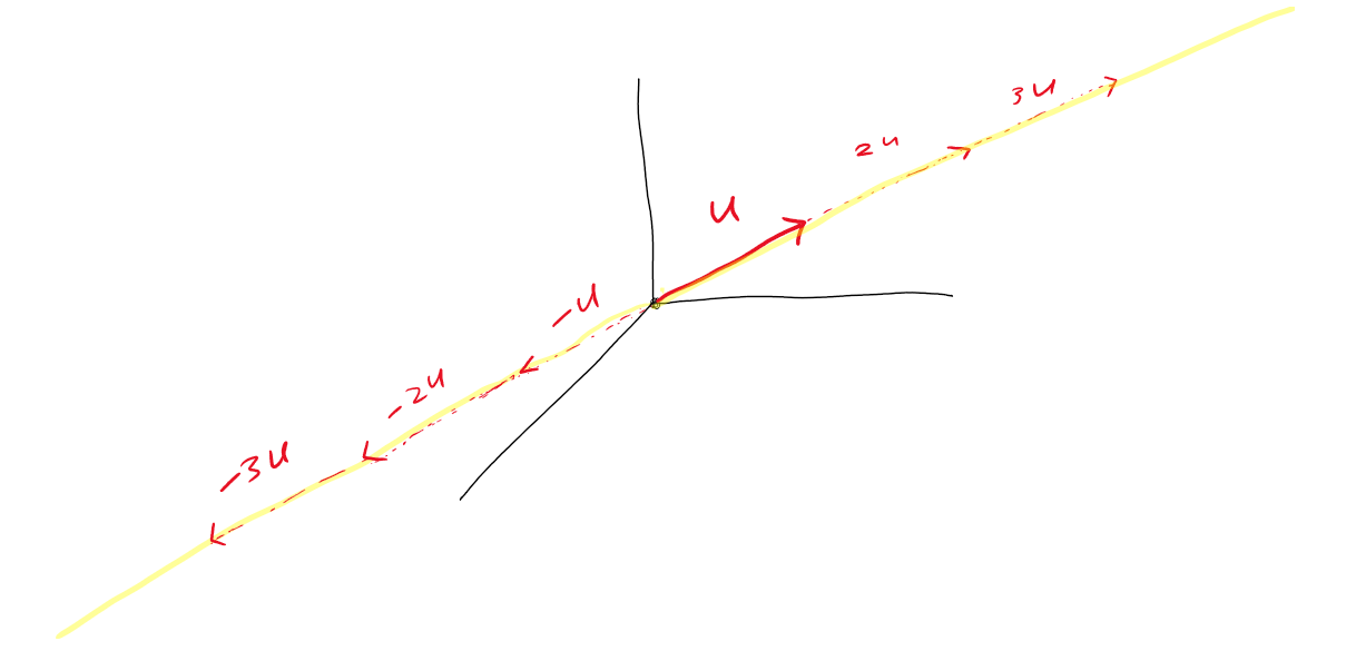 4차원 공간에서도 하나의 벡터에 스칼라를 곱한 것은 하나의 직선을 이룹니다. (4차원 공간을 제대로 그릴 수는 없지만 대략 이렇게 그릴 수는 있습니다.)