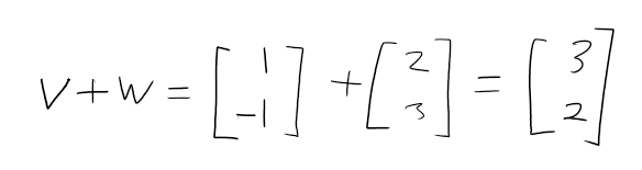 벡터에 스칼라를 곱해준 것들을 더하는 것을 바로 선형결합 또는 선형조합(linear combination)이라고 부릅니다. 벡터 v에 3을 곱한 것과 벡터 w에 2를 곱한 것을 더해주면 다음과 같이 됩니다.