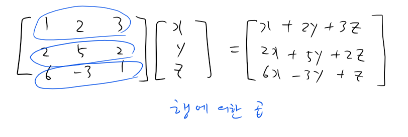 row를 이용한 곱은 우리가 고등학교 때 배운 방식으로 각 행 벡터과 벡터 x의 점곱(dot product)으로 각 성분을 구하는 것입니다.
