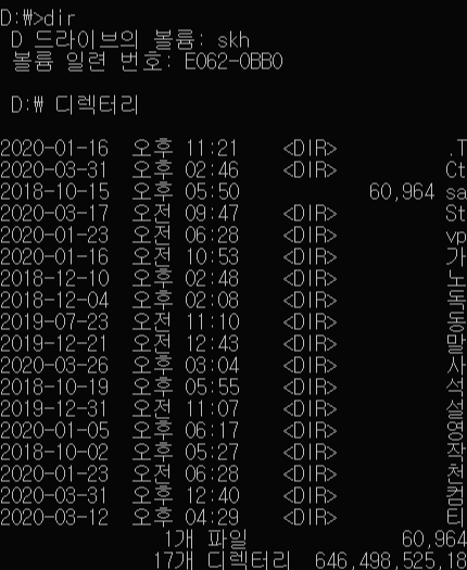 그리고 현재 폴더(디렉토리)의 목록은 'dir' 명령어로 확인할 수 있습니다.