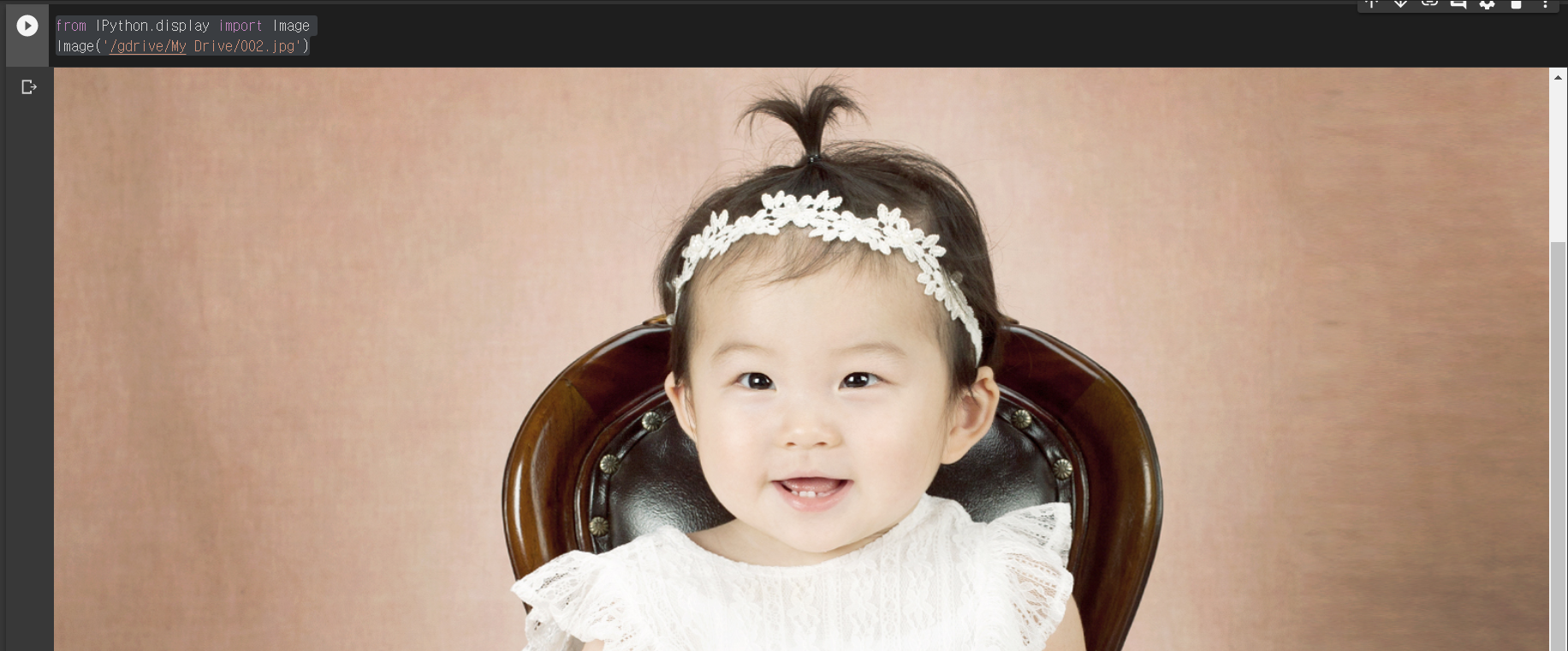 자, 이제 그림 파일 하나를 구글 드라이브에 연동한 후에 코랩에서 출력해보도록 하겠습니다. 저는 002.jpg라는 이름의 이미지 파일을 구글 드라이브에 업로드했습니다. 이것을 코랩에서 읽으려면, 이미지 파일명 앞에 다음과 같은 경로를 추가해줘야합니다.