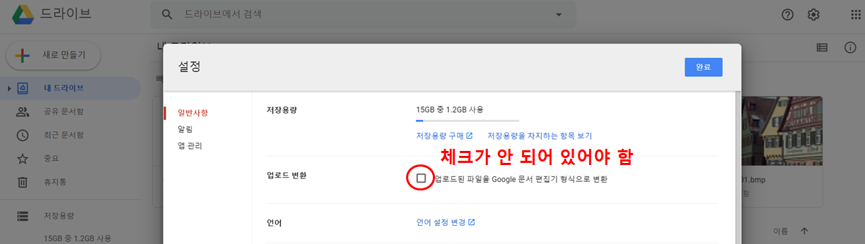 그러면 다음과 같은 화면이 뜰텐데, 여기서 업로드 변환이 혹시 체크되어 있다면, 해제해 주셔야 합니다.