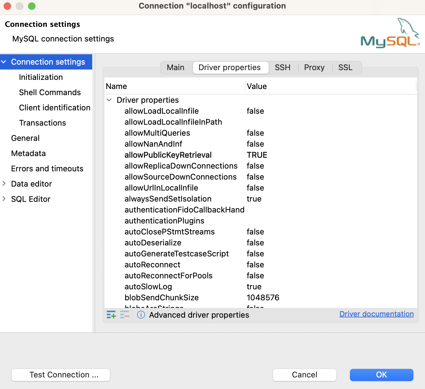 이런 경우에는 다음과 같이 Connection 설정 창에서 Driver properties 탭을 클릭한 후 allowPublicKeyRetrieval 속성과 useSSL 속성의 값을 수정해줘야 합니다.