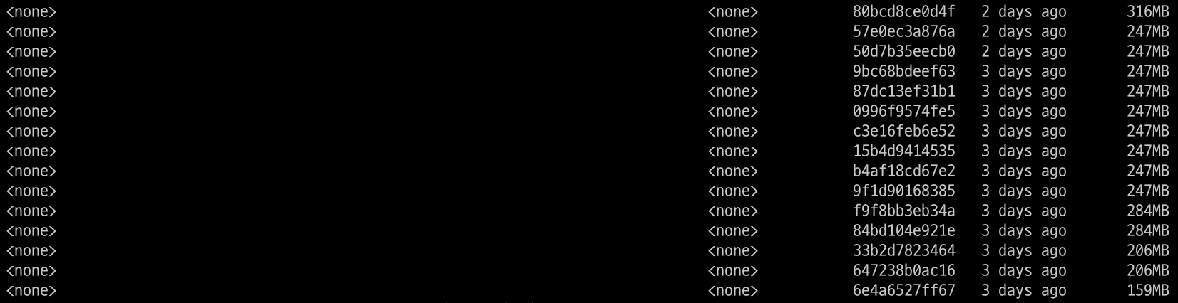 위와 같은 명령을 실행하면 <none>:<none>인 이미지들의 목록이 보여집니다.