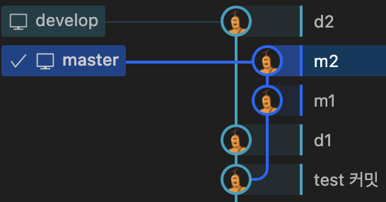 우선 설명을 위해 master 브랜치와 develop 브랜치를 만들겠습니다. master 브랜치에서 develop 브랜치를 분기한 이후에 master 브랜치에서는 m1, m2이라는 커밋이 있었고, develop 브랜치에서는 d1, d2이라는 커밋이 있었다고 하겠습니다. 이제 master 브랜치에서 develop 브랜치를 당겨와서 합치도록 하겠습니다.