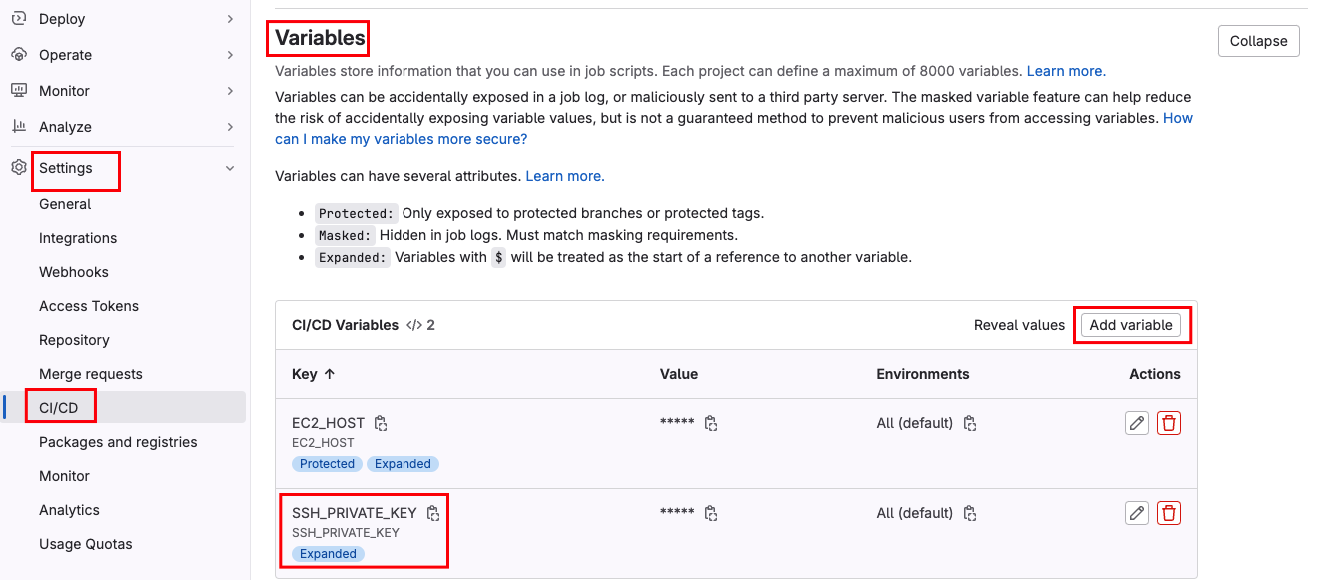레포지토리에서 Settings > CI/CD > Variables를 들어가시면 Add variable 버튼이 있습니다. 여기에 SSH_PRIVATE_KEY 변수를 만들어서 위에서 복사한 OPENSSH PRIVATE KEY를 담아주면 됩니다.