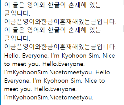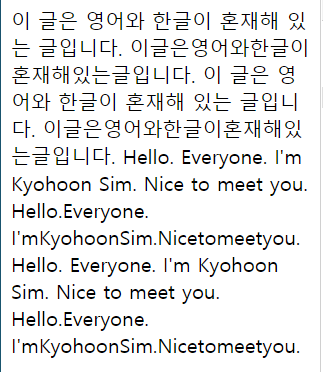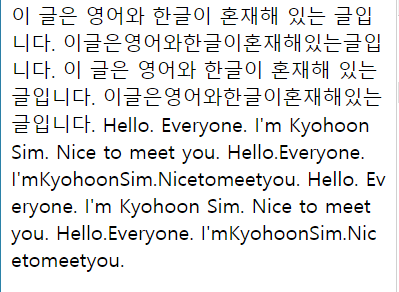 <p>이 글은 영어와 한글이 혼재해 있는 글입니다. 이글은영어와한글이혼재해있는글입니다. 이 글은 영어와 한글이 혼재해 있는 글입니다. 이글은영어와한글이혼재해있는글입니다. Hello. Everyone. I'm Kyohoon Sim. Nice to meet you. Hello.Everyone. I'mKyohoonSim.Nicetomeetyou. Hello. Everyone. I'm Kyohoon Sim. Nice to meet you. Hello.Everyone. I'mKyohoonSim.Nicetomeetyou.</p>