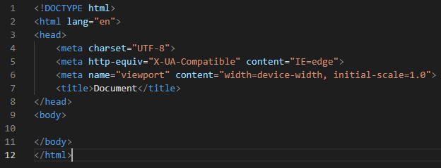 우선 vscode에서 html 문서를 하나 만들고 느낌표 + 탭을 눌렀을 때 자동으로 완성되는 코드를 보면서 가장 중요한 메타 태그들을 살펴보겠습니다. 중요하니까 자동완성으로 만들어지게 했겠죠?