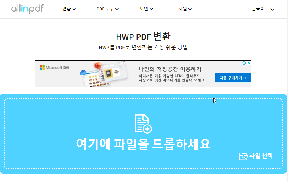 1. https://allinpdf.com/hwp-to-pdf 에 들어가서, 변환해줄 hwp 파일을 드롭해줍니다.