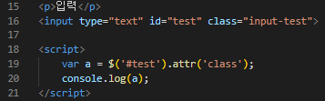 다음과 같이 id가 test인 input 요소가 있다고 가정하겠습니다. 이 input 요소의 class를 알고 싶다면, 다음과 같이 코딩을 해주시면 됩니다.
