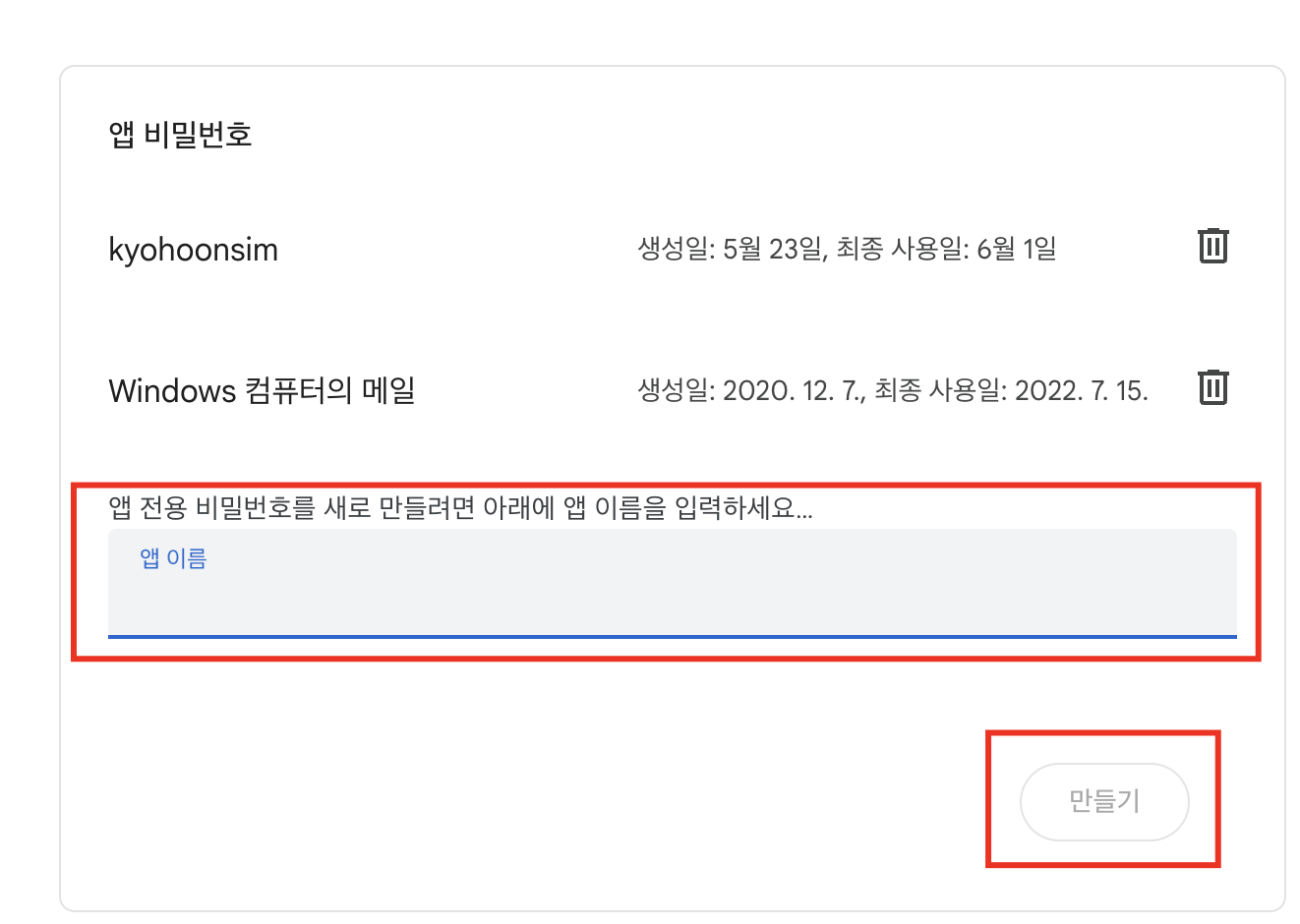 앱 비밀번호를 생성하는 방법은 다음과 같습니다.