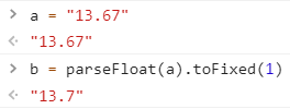 실수형으로 잘 변환되었습니다. 그런데 만약에 소숫점 둘째자리에서 반올림한 결과를 보고 싶다면 어떻게 해줘야 할까요? toFixed() 메소드를 활용하면 됩니다. 파라미터로 1을 전달해주면 소숫점 첫째자리까지만 보여줍니다. 단, 주의해야할 것은 자료형이 문자열로 바뀌었다는 점입니다.