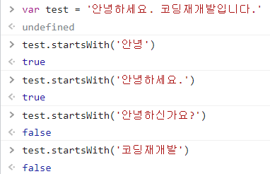 '안녕'은 '안녕하세요. 코딩재개발입니다.'의 앞 부분에 있는 문자열이기 때문에 true가 반환되었습니다. 반면, '안녕하신가요?'라는 문자열은 '안녕하세요. 코딩재개발입니다.'의 앞 부분에 있는 문자열이 아니기 때문에 false가 반환되었습니다.