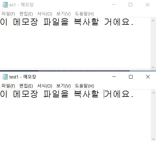 ex1.txt 파일을 복사하면서 이름은 test1.txt이 되게 했다. 제대로 파일이 복사되었는지 확인해보자. 우선 같은 폴더에 test1.txt이 생성된 것을 확인할 수 있다.