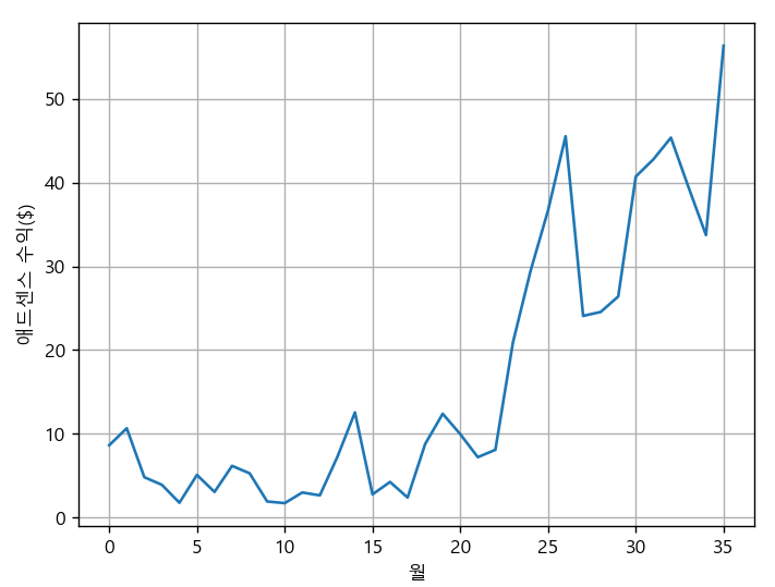 plt.ylabel('애드센스 수익($)')
