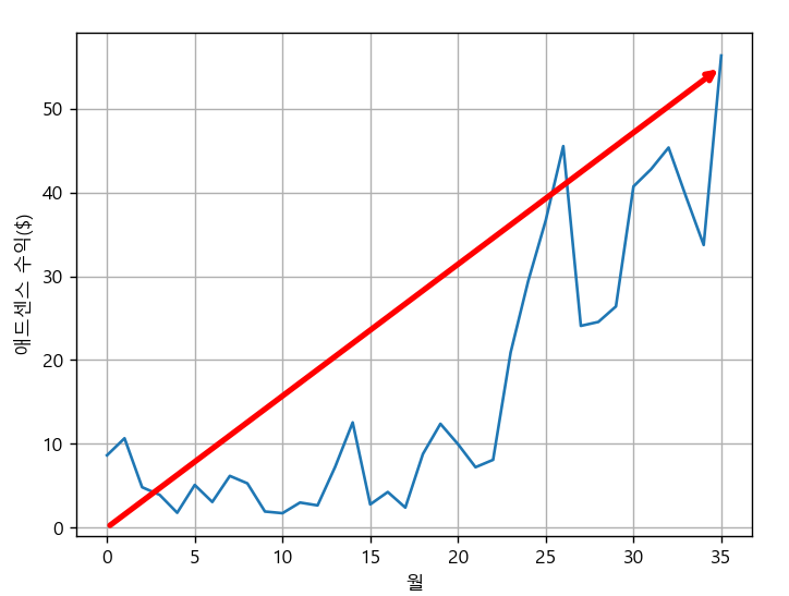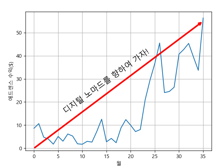 월 수익이 전체적으로 증가하고 있다는 추세를 나타내기 위한 화살표를 넣어보겠습니다. 그래프 상에서 (0, 0)부터 (35, 55)까지 lw(line width)가 3인 화살표를 그려보도록 하겠습니다. annotate 함수를 사용한 아래 코드만 추가되면 됩니다. xytext가 화살표의 시작점이라고 보시면 되고, xy가 화살표의 끝점이라고 보시면 됩니다.